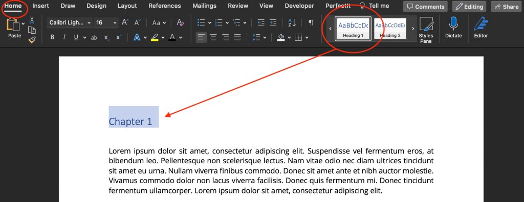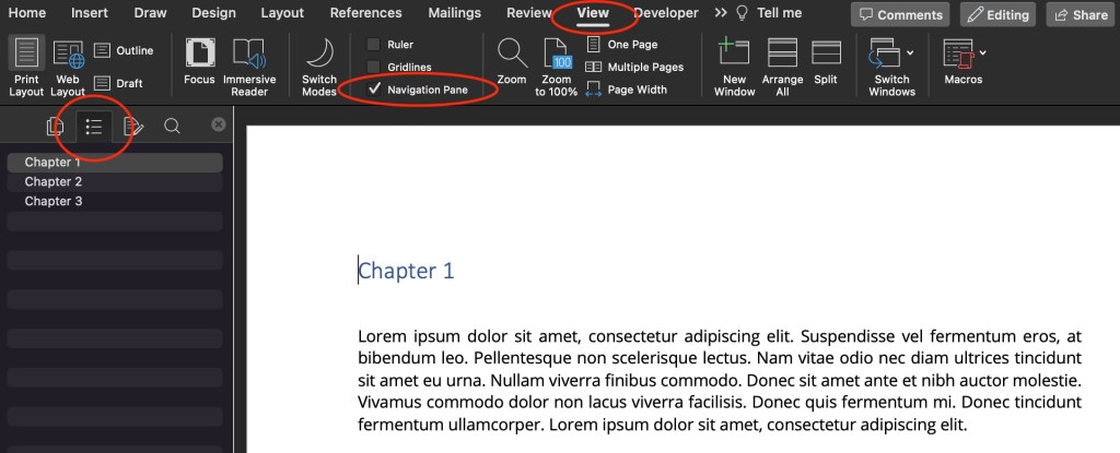Once you’ve assigned a headings style to each of your chapters, you can use the Navigation Pane to navigate around your document.