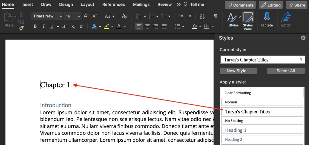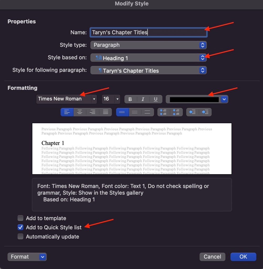 - Write in a name for your style (I chose “Taryn’s Chapter Titles”)