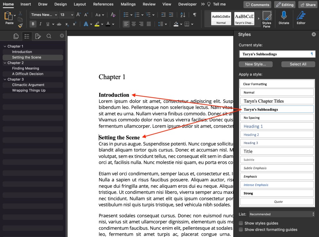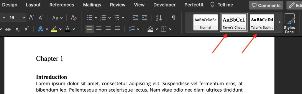 You can change these manually by highlighting the chapter title or subheading and using your usual font tools on your home tab. Or…